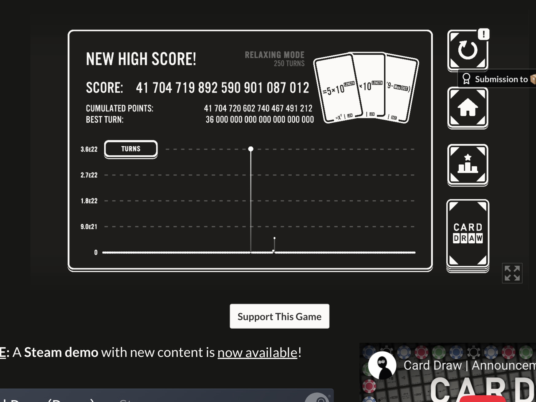 Edit2: Spamclicking 'draw card' got me to the victory screen after I presumably drew all my remaining attempts. The cards I drew never updated however, and neither did my money available in the store. However, I ended up with 6.6e10, so that's something, I guess- though the ending graph also just cuts off, not showing my last 82 draws.